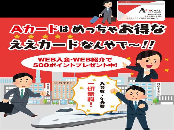 Aカードとは、加盟ホテル471店舗(+レストラン37店舗)で利用ができ、ポイントが貯まると現金でキャッシュバックするお得なカードになります。また、Aカードをお持ちのお客様はお名前のみのチェックインが可能となり、スムーズにチェックインを行うことが出来ます。(一部店舗を除く)