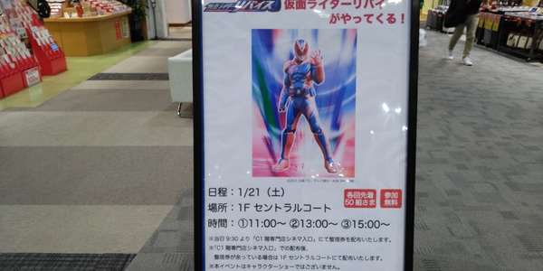 写真の通り1月21日、昨年8月まで放映されていた「仮面ライダーリバイス」の作品内に登場するメインライダーが1階セントラルコートにお出ましするとの事です!!!