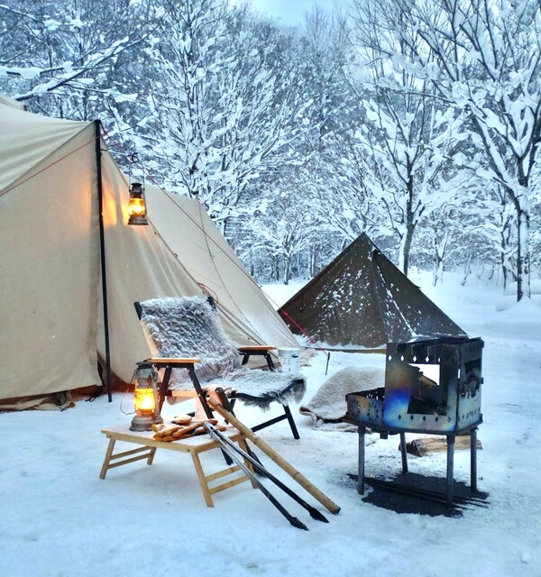 十和田湖の冬、雪が積もるキャンプ場にてテント泊ができる稀有な体験です。