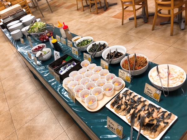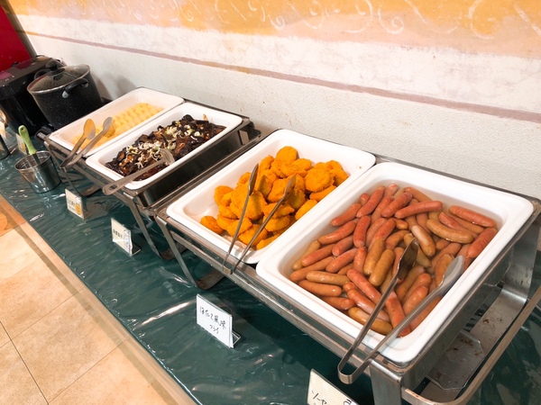 左から、スクランブルエッグ、麻婆茄子、ホタテ風フライ、ウインナーです♪