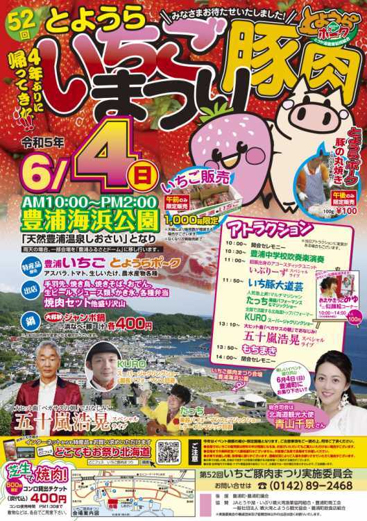 毎年、2万~3万人が来場する豊浦町内最大級の人気イベント。今回は、豊浦イチゴ「けんたろう」「とちおとめ」など1千箱(1箱4パック入り、1800~2800円)を午前中、1人1箱で限定販売する。とようらポークの丸焼き(100グラム100円)は午後から売り出す。また、ホタテなどが入った浜鍋や豚汁を1杯各400円で提供するほか、焼き鳥や焼きそばなどの出店が並ぶ。