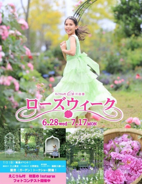 美しく香りのよいイングリッシュローズとオールドローズ中心に、650品種、約5,000株のバラが開花し、庭園がバラの香りに包まれ華やかで優雅な雰囲気になる時期。ロズビィのバラ畑にある幸福の扉や、ローズガーデンのツルバラが咲くアーバーなど絵になる風景がたくさんある。5,000株のうち約3,500株は食べる為のバラで、農薬や化学肥料を使わずに安全に育てたバラを使ったオリジナルのローズスイーツも楽しめる。