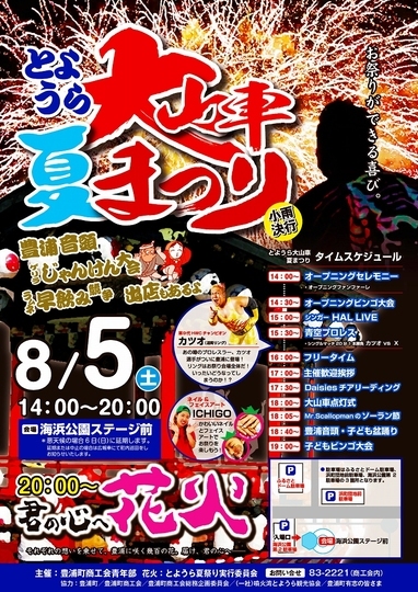 午後6時には、18年のまつり開催時に復活した大山車の点灯式を実施。道南リング代表のカツオさんが登場する青空プロレス(午後3時半)、豊浦音頭・子ども盆踊り(午後6時40分)、子どもビンゴ大会(午後7時)などの催しも用意されている。