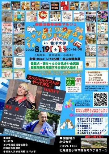 保護猫と保護犬の譲渡会。プロ野球日本ハムの新旧公認応援ソングを歌う歌手のHARTY(ハーティ)さんと宮本毅さんらがゲスト出演し、イベントを盛り上げる。
