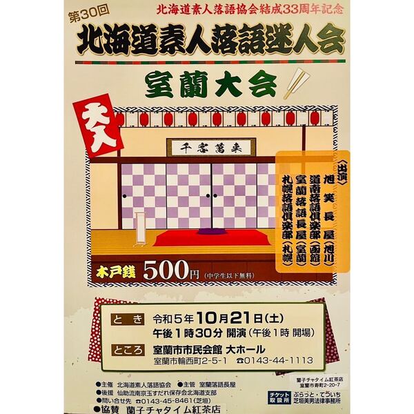 道素人落語協会は1991年に結成し、構成する室蘭、札幌、旭川、函館のアマチュア落語会が持ち回りで開いている。室蘭大会では13演目が披露される。