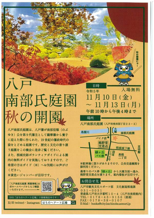 11/10(金)~13(月)八戸南部氏庭園で「秋の開園」が行われます。