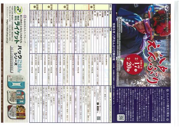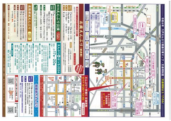 VISITはちのへから、「えんぶり」期間の行事予定と、2/17(土)に行われる「一斉摺り」に伴う中心街の通規制(9:30~12:00)についてのチラシが配布されています。