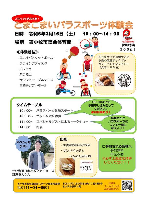 障害者スポーツに親しんでもらおうと開催。当日は車いすソフトボールや、音の鳴るピンポン球を転がして打ち合うサウンドテーブルテニスなど全6種類の競技を体験すると、先着100人にパン店「小麦の奴隷苫小牧店」のカレーパンをプレゼントする。プロ野球北海道日本ハムファイターズの元投手、新垣勇人さんらによるトークショーも行われる。