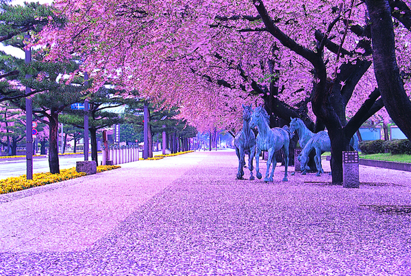 日本の道・100選に選ばれた官庁街通り、通称「駒街道」には、155本の桜が咲き、