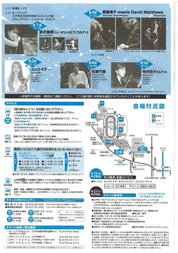 個人的には、世界的なジャズピアニスト(グラミー賞を受賞)で、「マンハッタン・ジャズ・クインテット」でも有名な「デビッド・マシューズ」さんと、沖縄県出身の伝説のJAZZシンガー「齋藤悌子」さんの二人に、八戸市出身のトランペッター「類家心平」さんがゲスト参加する、「齋藤悌子 meets David Matthews」の演奏が楽しみです。