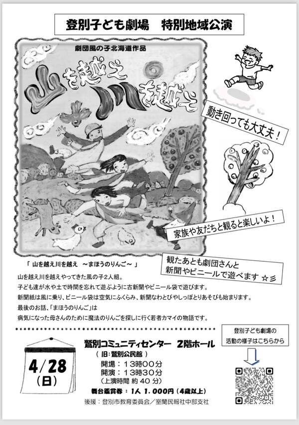 登別子ども劇場は舞台鑑賞や自然体験などを企画。今回は演劇「山を越え川を越え~まほうのりんご~」を上演する。