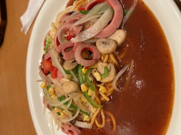 少しピリ辛なソースとスパゲティの相性が最高です、また、ブラックペッパーがきいているのでくせになるうまさです。