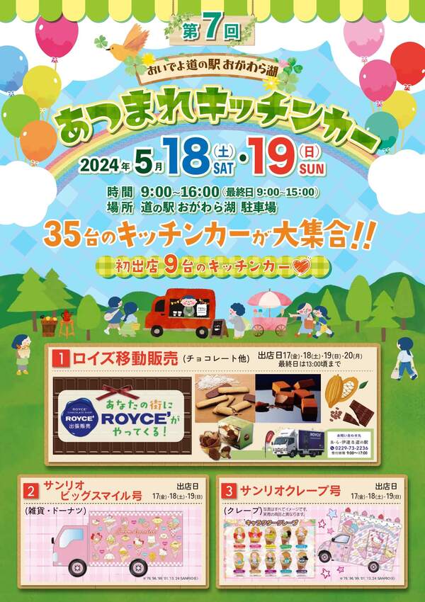 キティーちゃんのサンリオカフェワゴン「ビッグスマイル号」、「サンリオクレープ号」、チョコレートのロイズの移動販売など多数のキッチンカーが出店します。