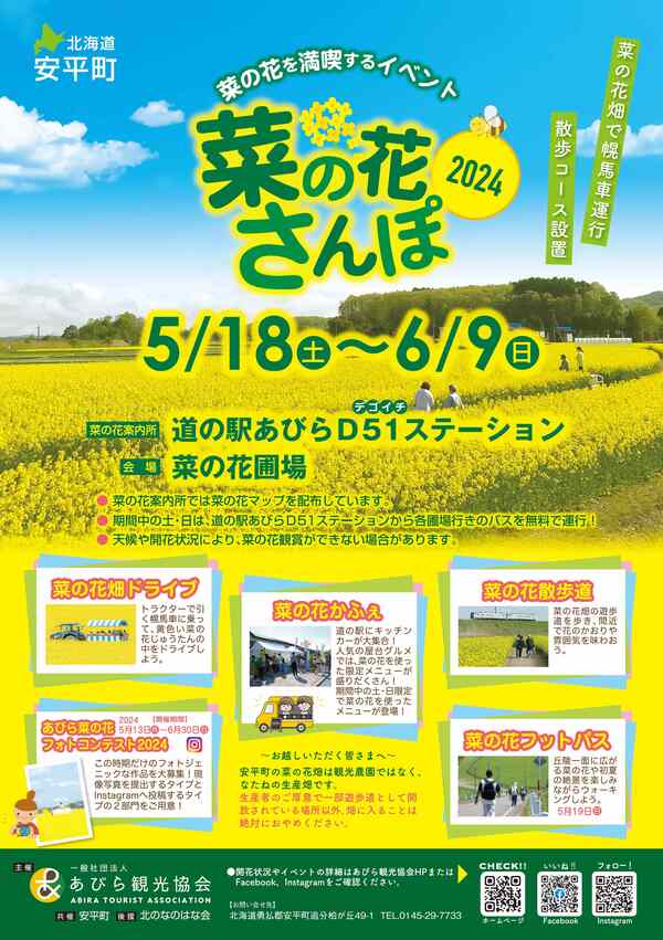 安平町特産の菜の花を楽しむイベント。道の駅あびらD51ステーションを基点に、菜の花畑を自家用車や無料バスで巡り、菜の花をあしらった食事やお菓子を味わう。