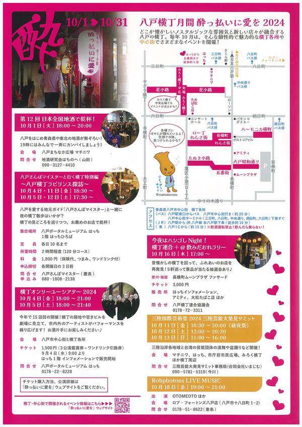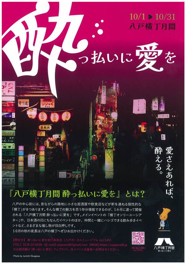 毎年10月に開催されている「八戸横丁月間 酔っ払いに愛を2024」が、今年も「10月1日(火)〜31日(木)」の期間、八戸中心街にある八つの横丁で開催されます。