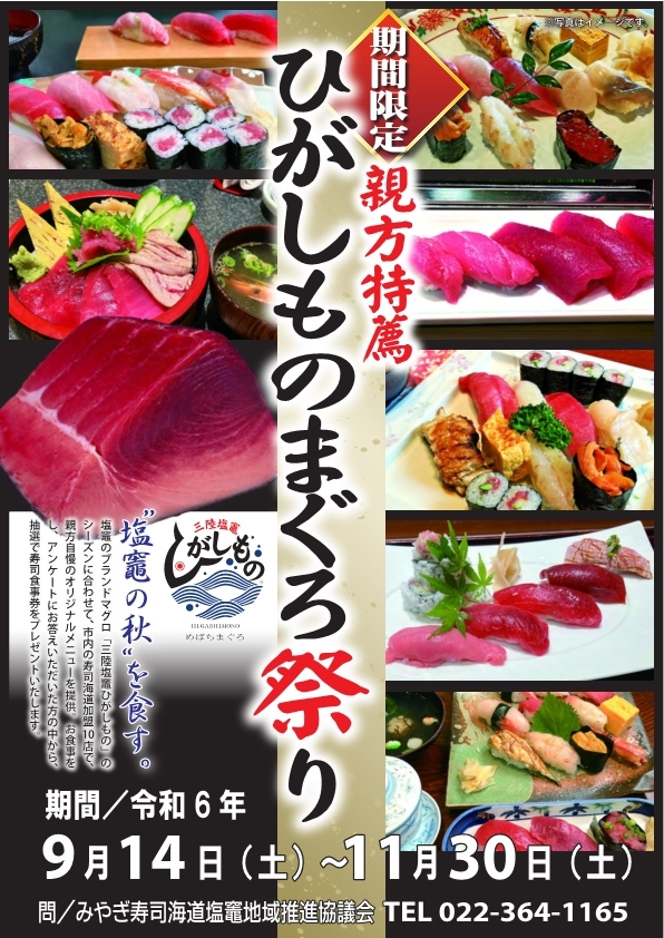 塩竈のブランドマグロ「三陸塩竈ひがしもの」のシーズンに合わせて、塩竈市内の寿司海道加盟10店で、親方自慢のオリジナルメニューを提供します。