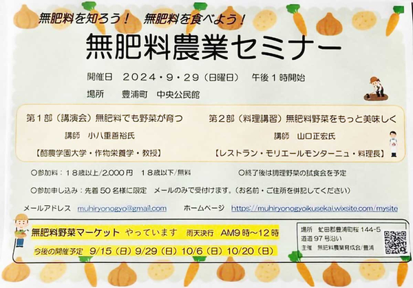 無肥料農業について学ぶセミナー。酪農学園大の小八重善裕教授(作物栄養学)が講演するほか、料理講習もある。