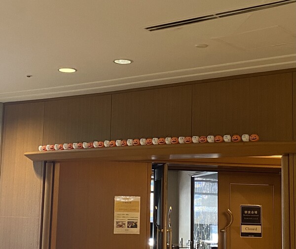 カウンターには中くらいな大きさのかぼちゃ、そして朝食会場前の頭上には小さいおばけ&かぼちゃ達が皆様をお出迎えしております♪